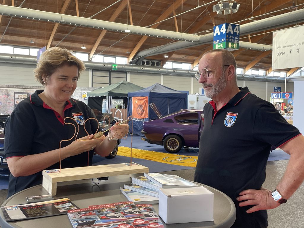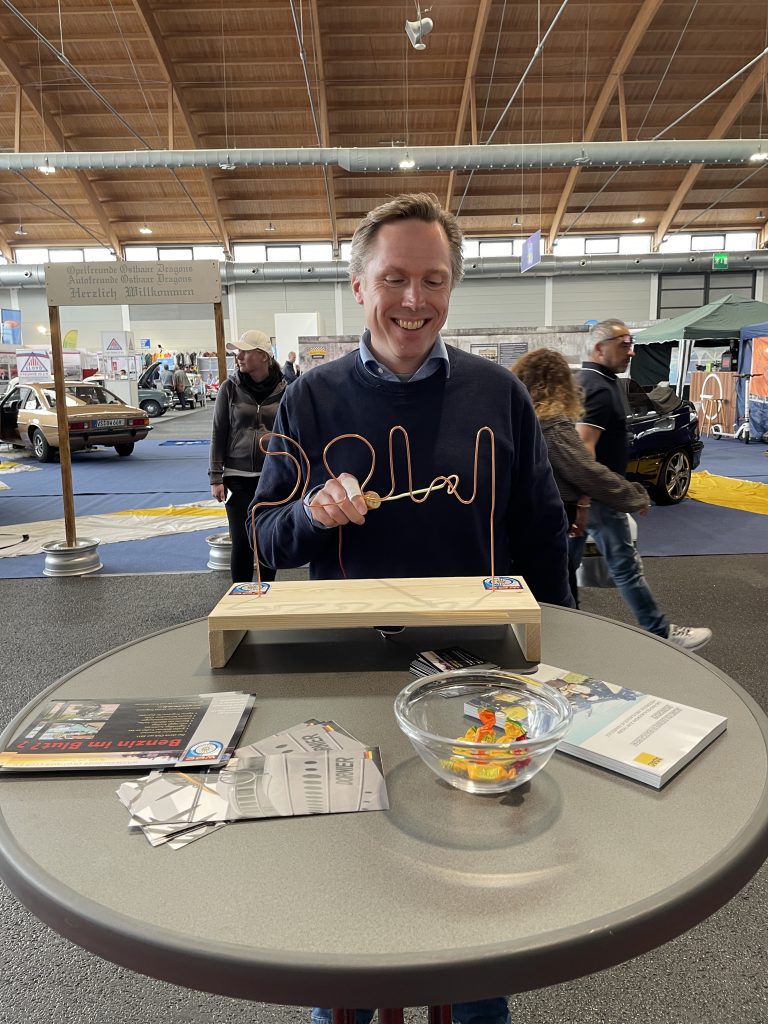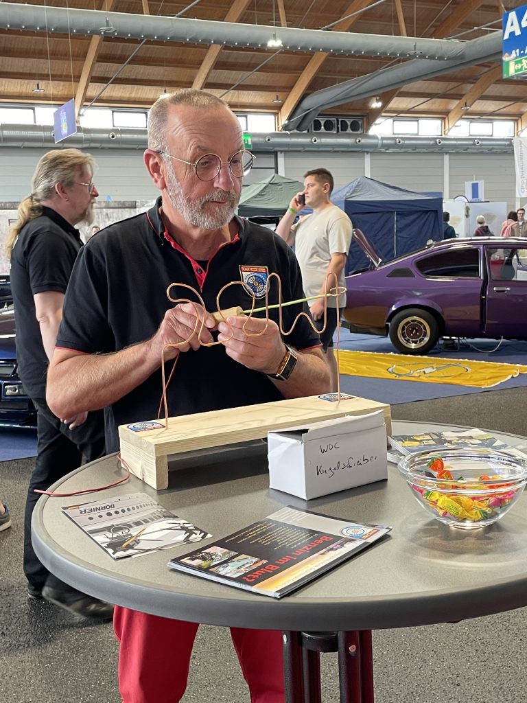 Die Eyecatcher des Standes waren der VW Käfer vom Florian, die toprestaurierte und seltene BMW R 68 vom Roman und der „heiße Draht“, konstruiert und gebaut von unserem Gönner Dieter Friesewinkel von der Scuderia Humpis. Der Käfer und die BMW wurden eher von den Besuchern des älteren Semesters bewundert. Dagegen war der „heiße Draht“ der absolute Renner für die Jüngeren. Wir vom Standpersonal haben noch nie so viele höchstkonzentrierte Kinder und Jugendliche gesehen.